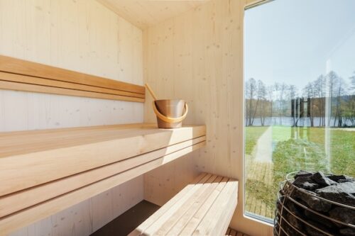 Our new fully functional modular sauna with two large floor-to-ceiling windows and a shower room.