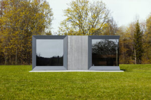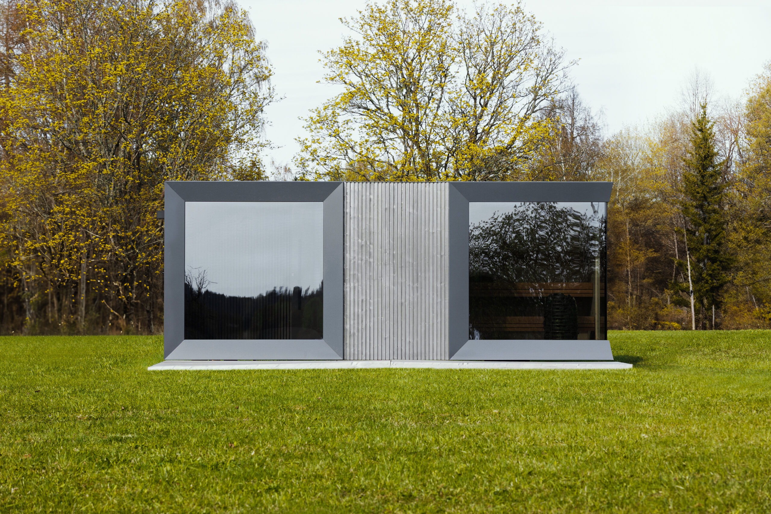 Our new fully functional modular sauna with two large floor-to-ceiling windows and a shower room.
