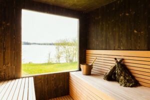 Our new fully functional modular sauna with two large floor-to-ceiling windows and a shower room.